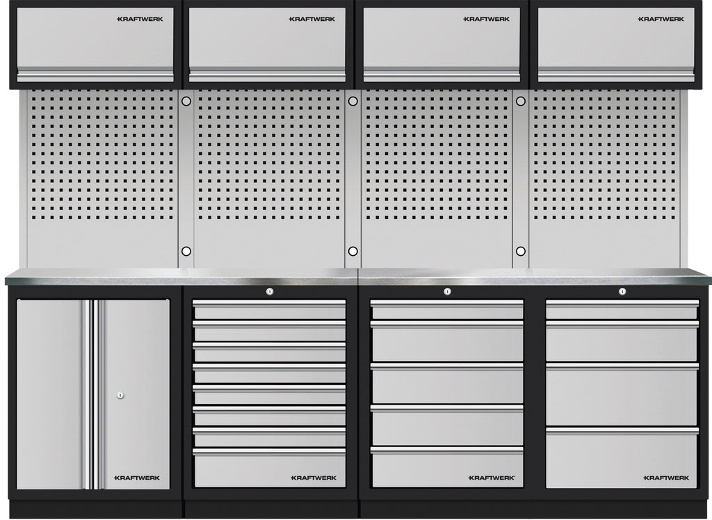 L'ensemble KRAFTWERK MOBILIO, composé de 4 éléments, offre un espace de rangement maximal dans un format compact. Ses 17 tiroirs à roulement à billes, répartis à différentes hauteurs, permettent une organisation et un rangement optimaux de vos outils. Le caisson à 8 tiroirs est idéal pour les petits outils et accessoires, tandis que les caissons à 5 et 4 tiroirs conviennent aux outils de taille moyenne. Le meuble bas à double porte permet de ranger en toute sécurité des outils ou matériaux plus volumineux. Avec ses dimensions généreuses (L 2720 x H 2000 x P 488 mm), il offre un volume de rangement important.