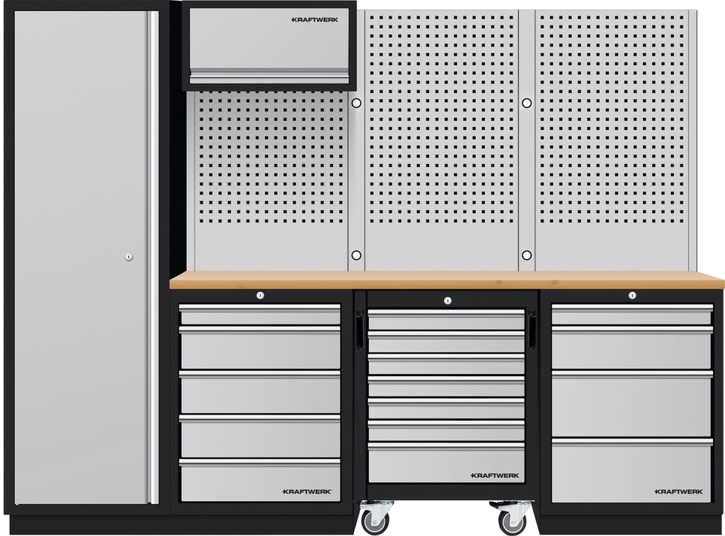 Avec l'ensemble KRAFTWERK MOBILIO 4 éléments, vous disposez d'une solution polyvalente pour un atelier parfaitement organisé. Composé de caissons à tiroirs, d'un chariot d'atelier mobile, d'une armoire haute et de panneaux perforés robustes, cet ensemble offre tout le nécessaire pour ranger efficacement vos outils et les garder à portée de main. Grâce à son plan de travail en contreplaqué de hêtre de haute qualité et à sa conception autoportante et flexible, ce système s'adapte parfaitement à vos besoins spécifiques.