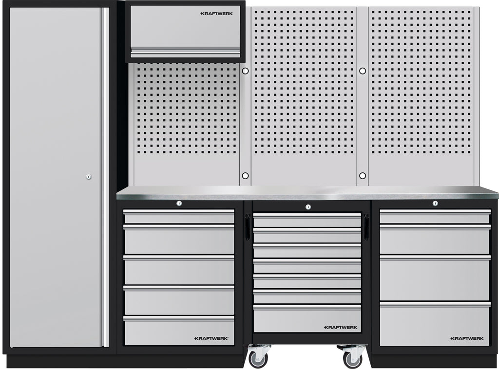 Avec la combinaison KRAFTWERK MOBILIO 4 éléments, vous disposez d'une solution polyvalente pour un atelier parfaitement organisé. Cet ensemble composé d'armoires à tiroirs, d'un chariot d'atelier mobile, d'une armoire haute et de panneaux perforés robustes offre tout le nécessaire pour ranger efficacement vos outils et les garder à portée de main. Grâce à son plan de travail en acier inoxydable de haute qualité et à sa conception autoportante et flexible, ce système s'adapte parfaitement à vos besoins spécifiques.