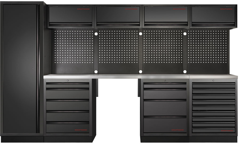 Avec le module combinable KRAFTWERK MOBILIO BLACK 5 pièces, créez l'atelier idéal, alliant flexibilité, espace de rangement et organisation. Professionnel ou amateur, ce système répond à tous vos besoins. Grâce à ses 18 tiroirs, 5 placards et son panneau perforé carré robuste, votre matériel est toujours à portée de main et parfaitement rangé.