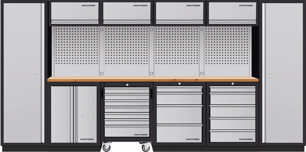 L'ensemble de meubles bas KRAFTWERK MOBILIO à 4 modules mesure 910 mm de haut x 2720 mm de large x 721 mm de profondeur et s'intègre parfaitement dans tous les ateliers. Sa construction robuste et sa flexibilité maximale en font la solution idéale pour optimiser l'organisation et l'efficacité de votre atelier.