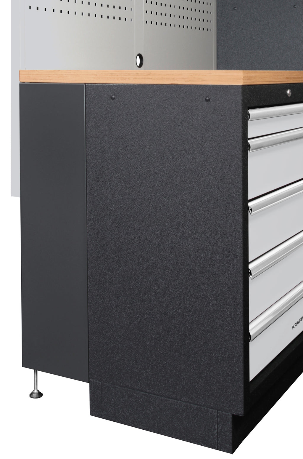 L'ensemble de meubles bas KRAFTWERK MOBILIO, composé de 4 éléments, offre une solution de rangement pratique et modulable pour votre atelier. Il comprend 17 tiroirs, un grand caisson et un plan de travail robuste en contreplaqué de hêtre. Grâce à sa conception autoportante, vous pouvez le positionner librement, sans fixations fixes, exactement où vous le souhaitez.