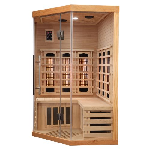 Le chromothérapie et ça Liseuse créer une ambiance atmosphérique, tandis que Façade en verre de sécurité de 8 mm d'épaisseur et le naturel bois de pruche pour donner à la cabine une apparence à la fois élégante et chaleureuse.
