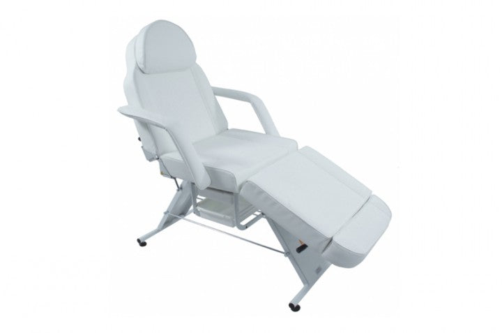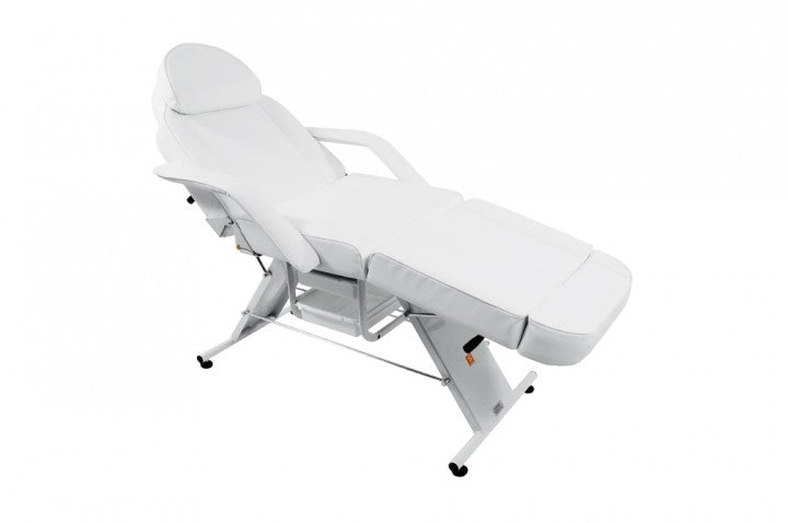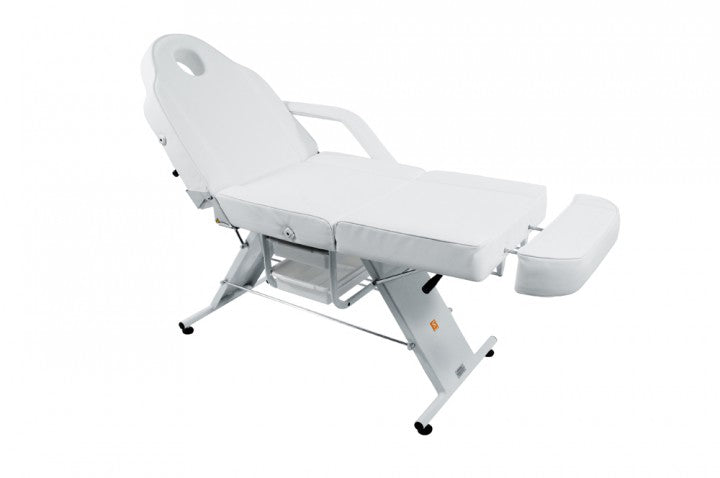 La table de soins s'incline complètement à l'horizontale. Le dossier et le repose-pieds sont réglables manuellement grâce à un mécanisme à cliquet. Les accoudoirs s'adaptent automatiquement à la position inclinée et sont également amovibles. Un coussin d'appui-tête assorti est fourni pour l'ouverture prévue à cet effet ; il est amovible et peut être inséré ou retiré selon les besoins. La table est dotée de deux compartiments de rangement coulissants sous l'assise. Son rembourrage d'environ 11 cm d'épaisseur offre un confort exceptionnel. La table de soins Lady I-1 est disponible en 39 coloris différents, vous permettant ainsi de l'harmoniser facilement avec votre environnement. Avec ce produit, vos clients pourront se détendre et profiter d'un confort optimal.
