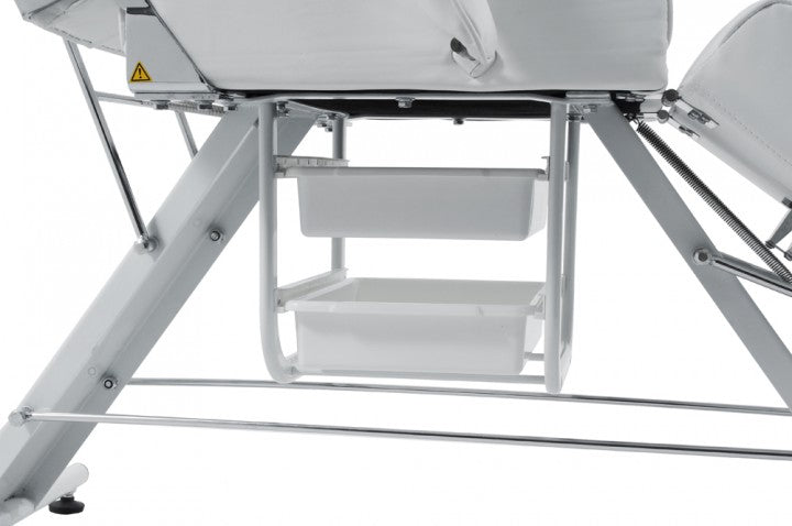 Cette table de soins esthétiques est équipée du nouveau système « Easy Click ». Ce mécanisme innovant est simple et rapide d'utilisation et garantit une sécurité maximale. Contrairement aux tables de soins classiques à accoudoirs clipsables, où les accoudoirs peuvent se déloger dès que le client s'appuie dessus, le nouveau système Easy Click élimine ce risque. Avec ce système, la sécurité est assurée.