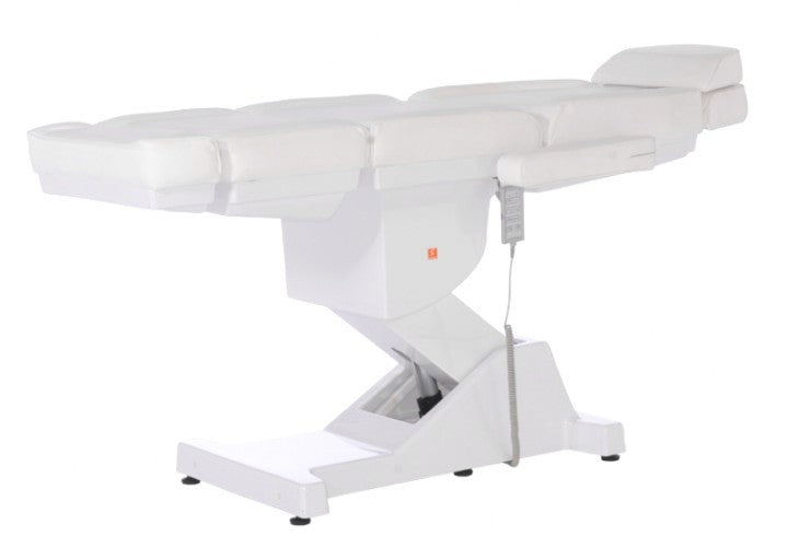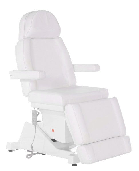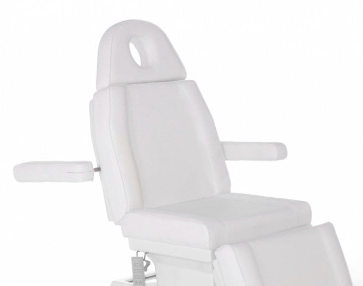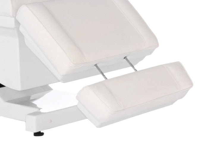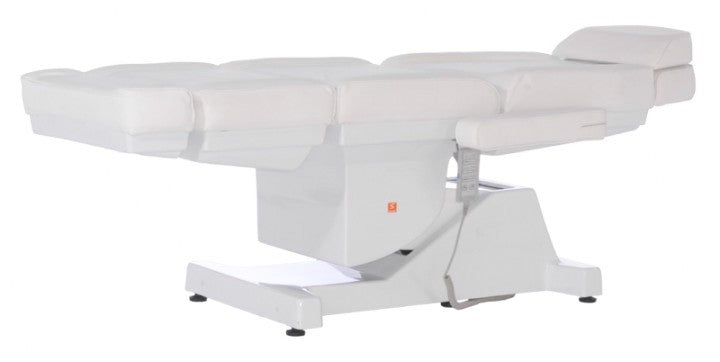 La hauteur, le dossier, la partie centrale et le repose-pieds de la table de soins sont réglables grâce à quatre moteurs et une télécommande. La table peut être inclinée à l'horizontale. Nouveauté : l'appui-tête et le repose-pieds sont extensibles et amovibles. Les accoudoirs s'ajustent automatiquement à l'inclinaison du dossier. Ils sont également rabattables vers le haut et vers l'arrière, facilitant ainsi l'accès latéral. Le rembourrage d'environ 11 cm d'épaisseur offre un confort exceptionnel . Le repose-pieds, rabattable à près de 90°, permet à vos patients de s'installer confortablement sur la table par l'avant.