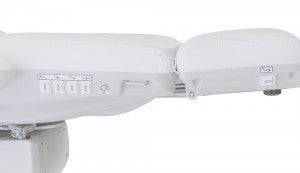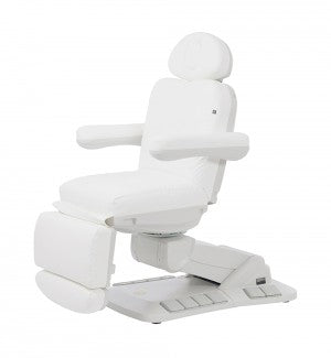Cette table de soins professionnelle se distingue par sa rotation manuelle à 90°. Quatre moteurs puissants et silencieux sont commandés par une pédale ou le panneau de commande latéral. La hauteur, l'inclinaison du dossier, l'inclinaison du siège et la position du repose-pieds sont réglables individuellement et en douceur. Les accoudoirs sont rabattables et coulissent horizontalement avec la table. L'appui-tête est doté d'une découpe rembourrée pour le visage, qui peut être fermée si nécessaire. À l'instar du repose-pieds, il est réglable manuellement pour s'adapter à toutes les morphologies.