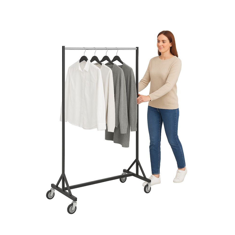 Le supports de transport robustes est la solution idéale pour un usage professionnel dans l'industrie de la mode, dans les entrepôts, les studios ou lors de salons professionnels. Grâce à sa construction robuste et à roues extra larges de 10 cm Le support peut être déplacé facilement et en toute sécurité, même sous des charges élevées et même sur des sols irréguliers.