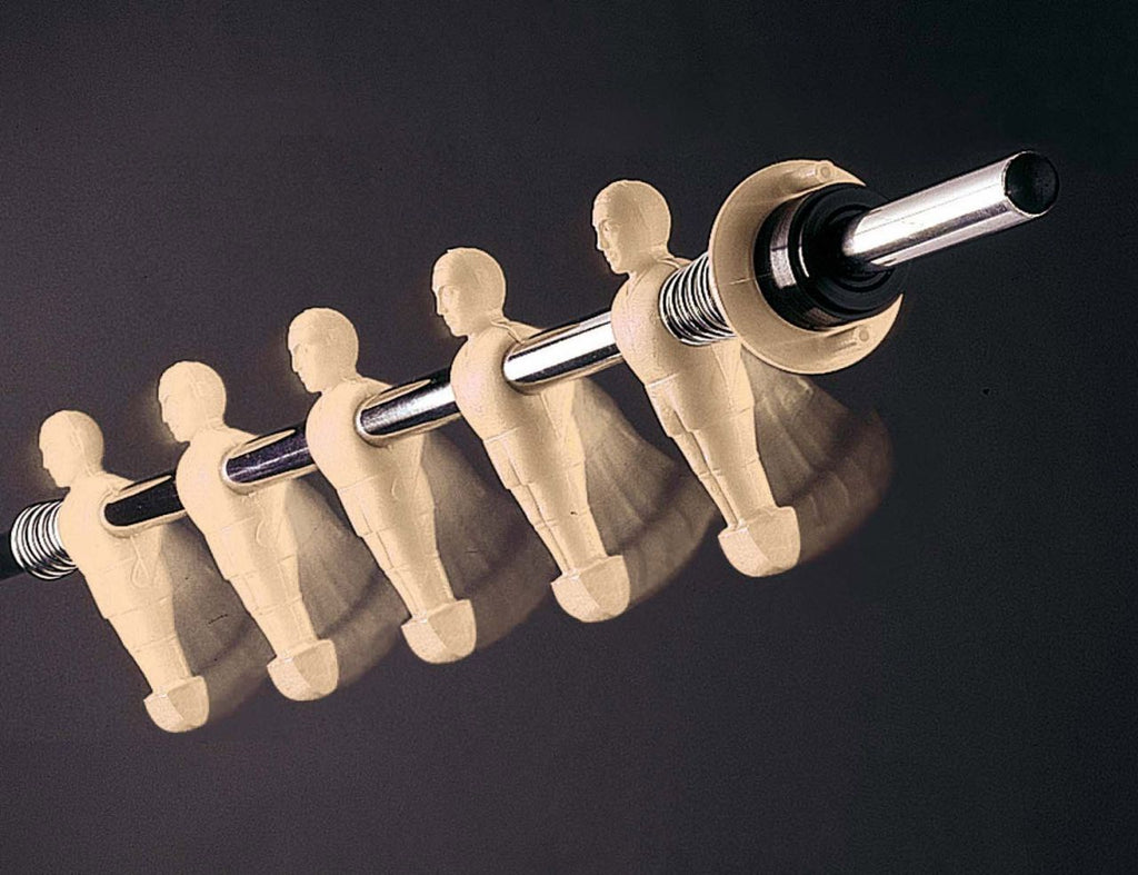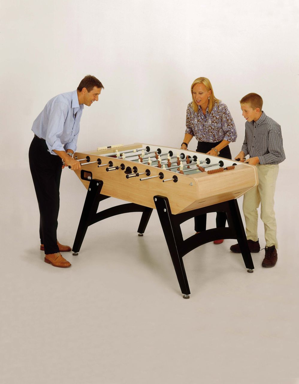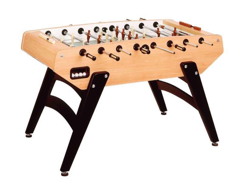 Un design complexe associé à une fabrication de haute qualité Ce baby-foot est doté d'une structure multicouche de 30 mm d'épaisseur, recouverte d'un stratifié robuste. Sa finition durable en bois de poirier est facile à nettoyer. C'est la table idéale pour une utilisation en intérieur, convenant parfaitement aux salles de jeux, aux écoles et aux clubs. Le jeu comprend des barres chromées robustes de 16 mm de diamètre, munies de poignées en bois et montées sur roulements à billes. Les joueurs, pratiquement incassables, sont moulés directement sur les barres et maintenus en place par des ressorts d'espacement.