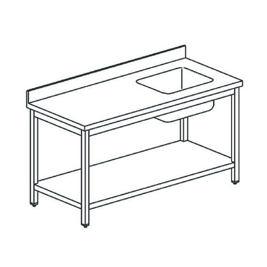 Table de travail Virtus & Mastro avec évier à droite, étagère intermédiaire et rebord surélevé, 1300 x 700 mm