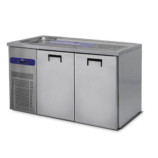 Isolation en polyuréthane. Isolation de 50 mm. Entièrement en acier inoxydable. Module technique avec compartiment neutre. Portes en acier inoxydable. Plan de travail avec un évier. Bac d'égouttage. Intérieur : Cadre de porte avec grille Rilsan et double rail. Évaporation automatique. Dégivrage automatique. Système de refroidissement ventilé. Lave-verres intégré. Accessoires : Modules de tiroirs 2x1/2, 3x1/3 et 1/3 + 2/3. Tiroirs avec glissières télescopiques en acier inoxydable, capacité de charge jusqu'à 30 kg.