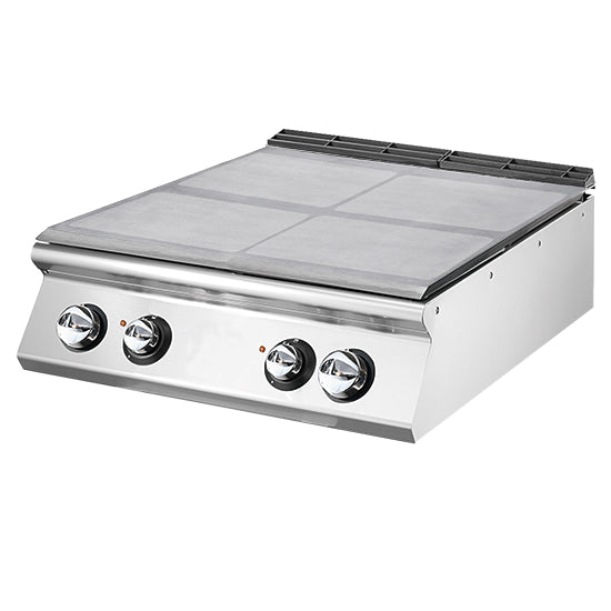 Plaque de cuisson électrique à 4 zones de cuisson. Panneaux latéraux, fond et panneau arrière en acier inoxydable. Plan de travail en acier inoxydable AISI 304 20/10. Cheminée en fonte émaillée. Plaque de cuisson robuste en acier. Quatre zones de cuisson indépendantes de 3,4 kW avec surface satinée. Thermostat de sécurité. Réglage thermostatique de la température de surface de 50 °C à 400 °C. Voyant lumineux indiquant la mise en marche et le bon fonctionnement. Boutons spécialement conçus pour empêcher les infiltrations d'eau dans le panneau de commande. Cheminée discrète.