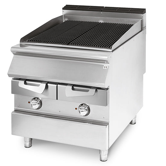 Parois latérales, fond et panneau arrière en acier inoxydable. Plan de travail en acier inoxydable AISI 304 20/10. Cheminée en fonte émaillée. Grille de cuisson à barres en acier inoxydable. Bac de récupération des graisses. Pare-éclaboussures à trois côtés en acier inoxydable AISI 304 et bac à graisse amovible, qu'il est recommandé de remplir d'eau pour faciliter le nettoyage. L'évaporation de l'eau attendrit les aliments grillés. Éléments chauffants blindés en Incoloy installés sous la grille de cuisson. Boutons spécialement conçus pour empêcher l'eau de pénétrer dans le panneau de commande. Équipé d'une cheminée basse.