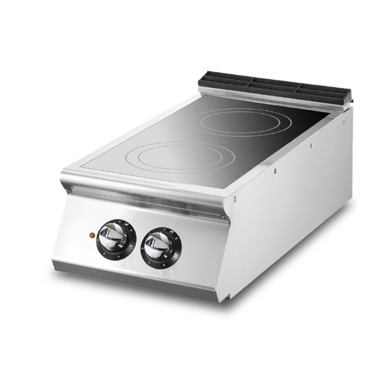 Panneaux latéraux, socle et panneau arrière en acier inoxydable AISI 304 20/10. Table de cuisson vitrocéramique à double foyer de 3,4 kW, équipée de deux zones de cuisson indépendantes et chacune dotée d'un régulateur de puissance. Chaque zone de cuisson est délimitée par un contour sérigraphié sur la vitre. Des voyants lumineux sur le panneau de commande indiquent l'activation de la résistance et le bon fonctionnement de l'appareil. Des boutons spécialement conçus empêchent l'eau de pénétrer dans le panneau de commande. Hotte aspirante discrète.