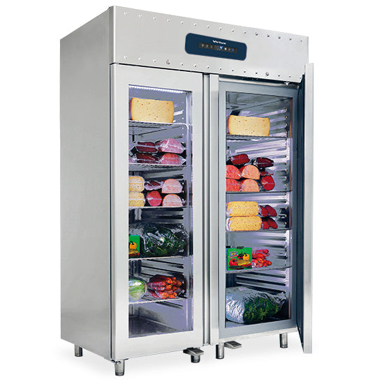 Virtus & Mastro Tiefkühlschrank 1400 Liter aus Edelstahl GN 2/1 mit Glastüren, -10°/-25°C, 75 mm Isolierung
