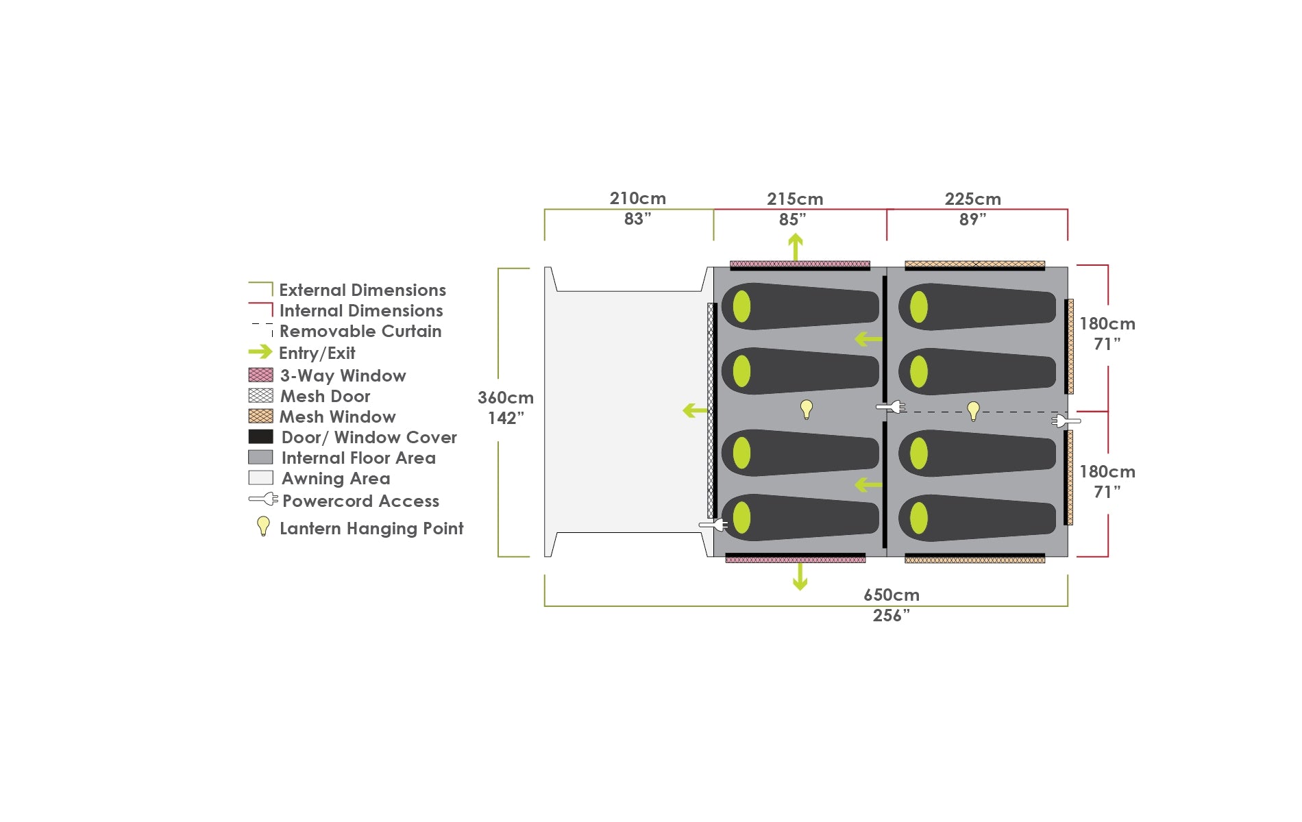 Vollständige SeitenöffnungenSchafft eine Verbindung zwischen Wohn- und Außenbereich des Zeltes und kann aufgestellt werden, um an warmen Tagen zusätzlichen Schatten und Luftzufuhr zu gewährleisten.