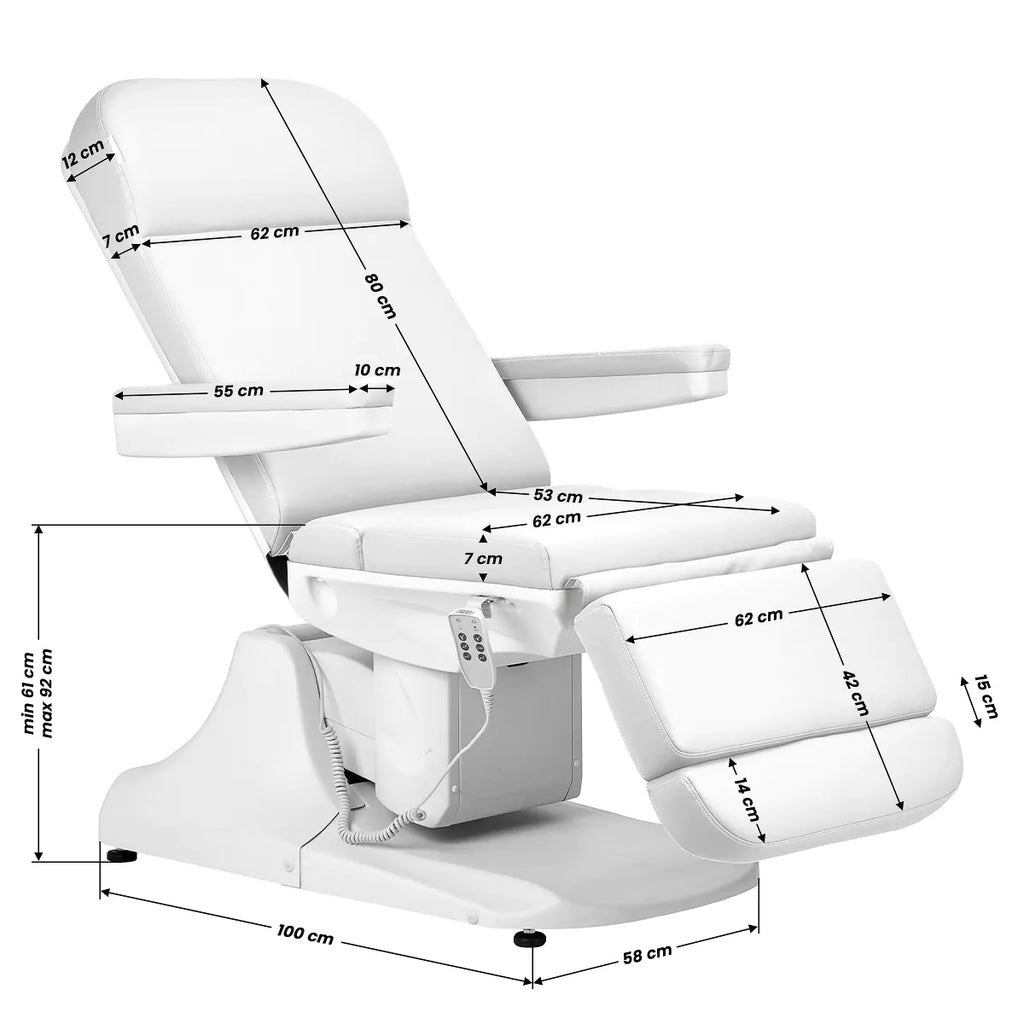 Die Sitzhöhe istvon 61 cm bis 92 cmverstellbar, und wenn der Stuhl vollständig ausgeklappt ist,erreicht er eine Länge von 190 cm. Diese Abmessungen ermöglichen eine einfache Verwendung des Geräts für Personen unterschiedlicher Körpergröße undermöglichen es, es an die Bedürfnissesowohl des Kunden als auch der Person, die den Eingriff durchführt, anzupassen.Griffe auf beiden Seiten des Sitzesermöglichen es Ihnen, die Fernbedienung frei aufzuhängen, so dass sie immer griffbereit ist.