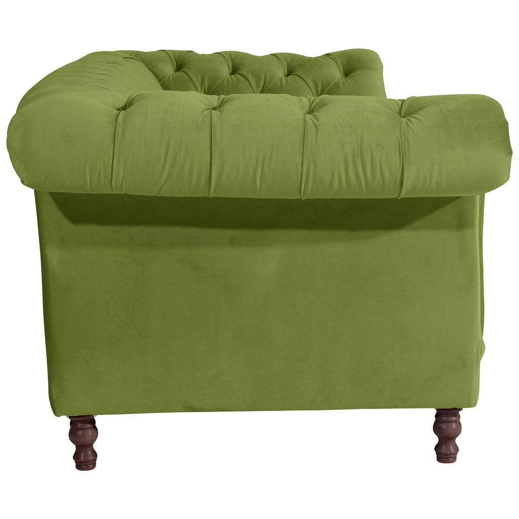 Stilvoll präsentiert sich dieses Sofa. Der hohe Rücken und die darin übergehenden Armlehnen wirken majestätisch und verleihen Ihrem Wohnraum ein königliches Ambiente. Mit handwerklicher Wertarbeit wurde die aufwändige Knopfheftung im Rücken, den Armlehnen und auf der Sitzfläche gefertigt. Der Bezugstoff ist ein weiches Samtveloursgewebe. Abgerundet wird das Sofa durch kunstvoll gedrechselte nussbaumfarbe Buchefüße. Die Rückseite ist mit Originalstoff bezogen. Die Füße sind zur einfachen Selbstmontage.