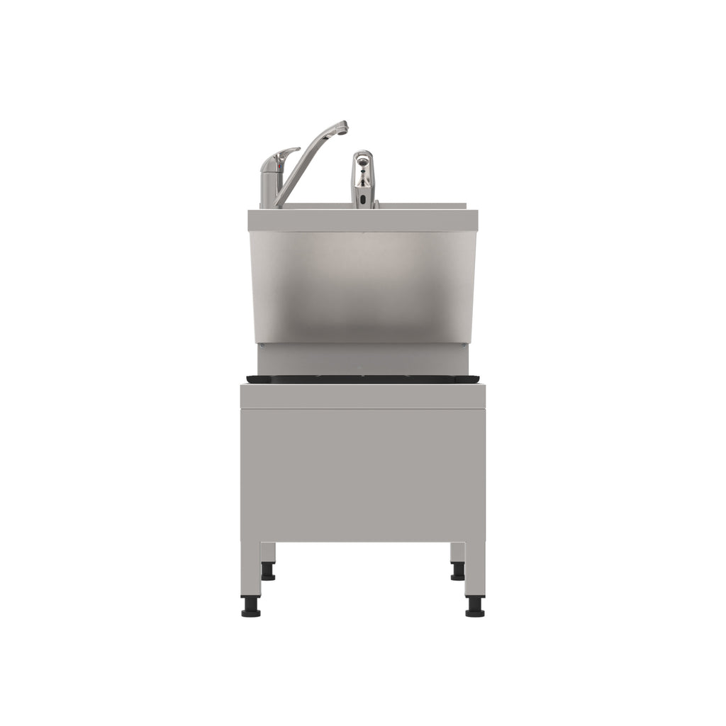 Die praktikable Verbindung aus Handwasch- und Ausgussbecken, mit Einhebelmischbatterie und berührungsloser Armatur in der Fußausführung für ein effizientes, zeitsparendes und hygienisches Arbeiten. Infolge der übereinander angeordneten Becken wird die Umsetzung eines platzsparenden Raumkonzepts ermöglicht. Unterhalb der Abdeckung befindet sich ein Einlegerost aus Kunststoff. Tiefgezogene Becken verhindern die Bildung von Schmutzfugen.
