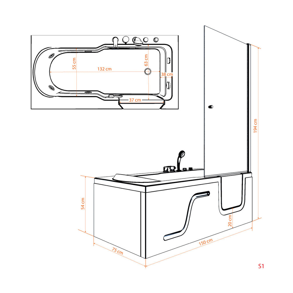 Acqua Vapore Seniorendusche und Sitzwanne Kombination Wanne mit Tür S17D-TH-L-EC 150x75x194cm