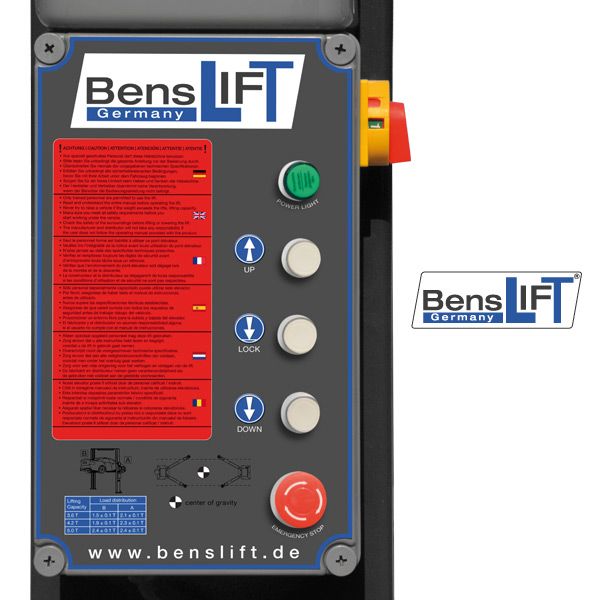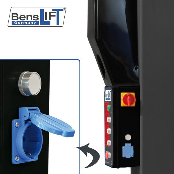 Anti-Lift-Up-Button, zum zielgenauen Ablassen der Hebebühne ohne vorhergehendes automatisches Anheben. Sowie eine praktische 230 V Steckdose direkt am Schaltkasten.