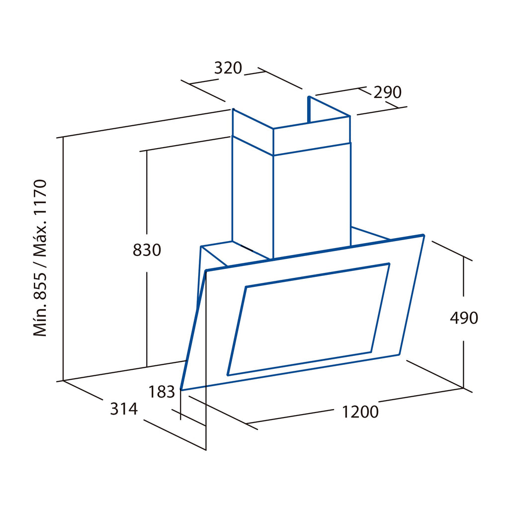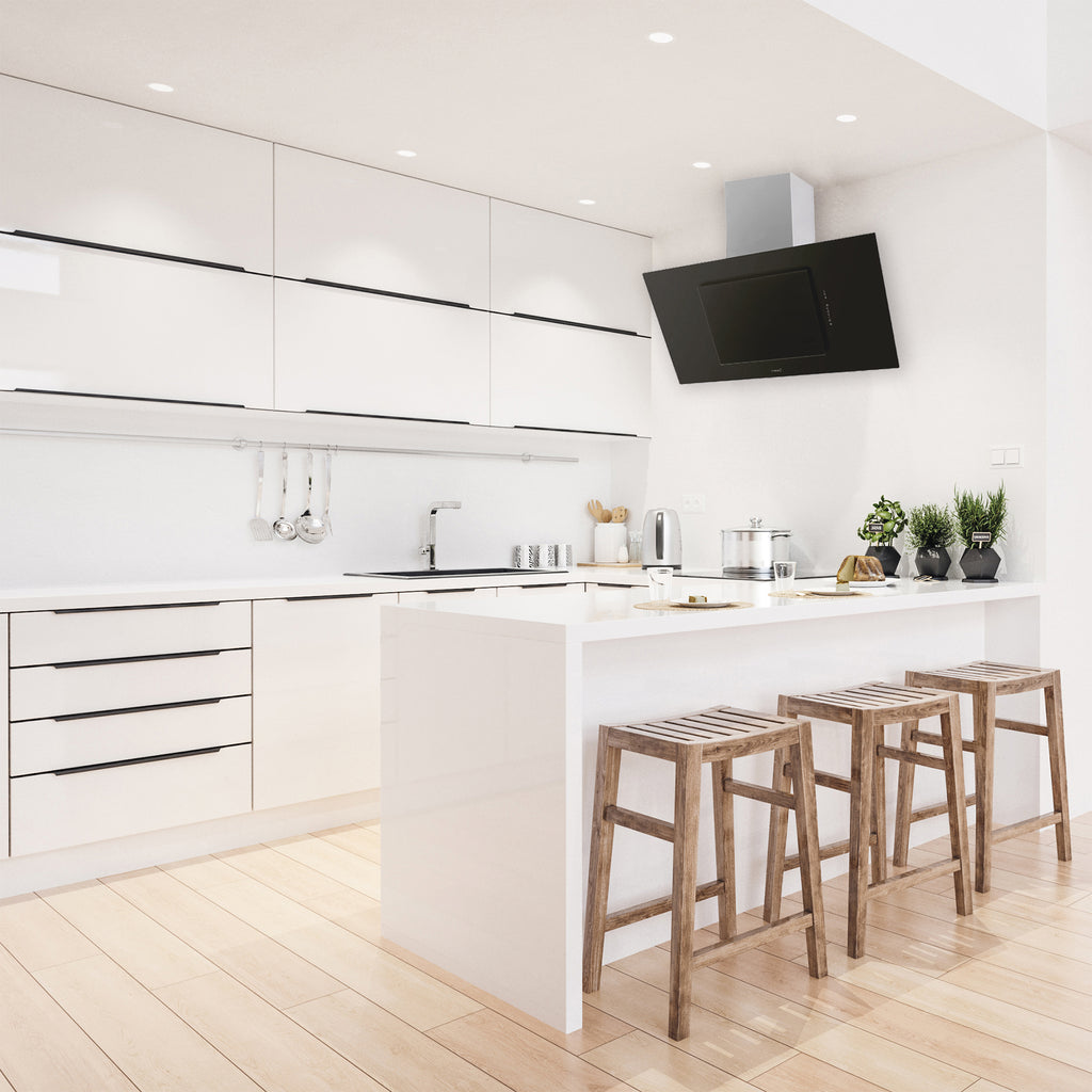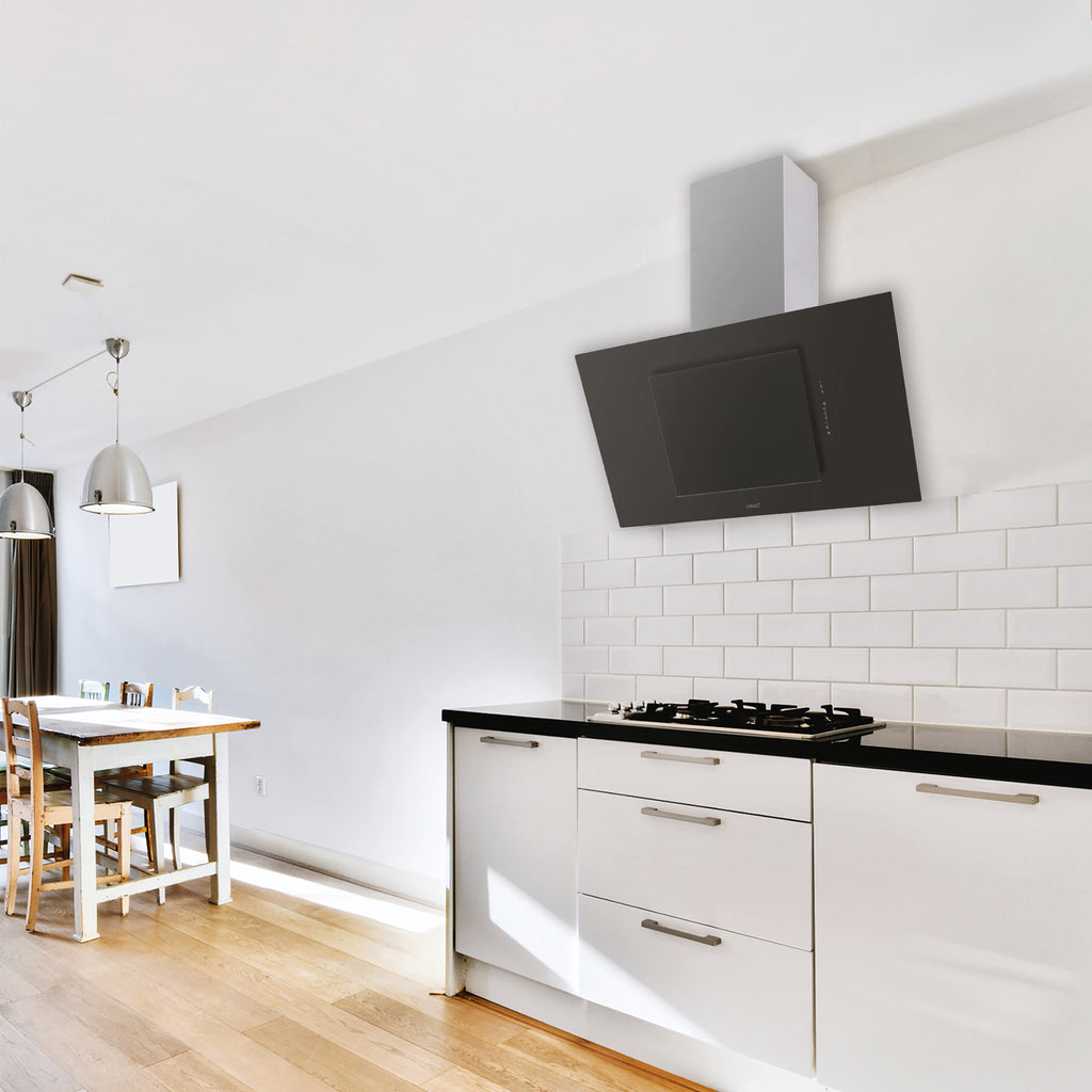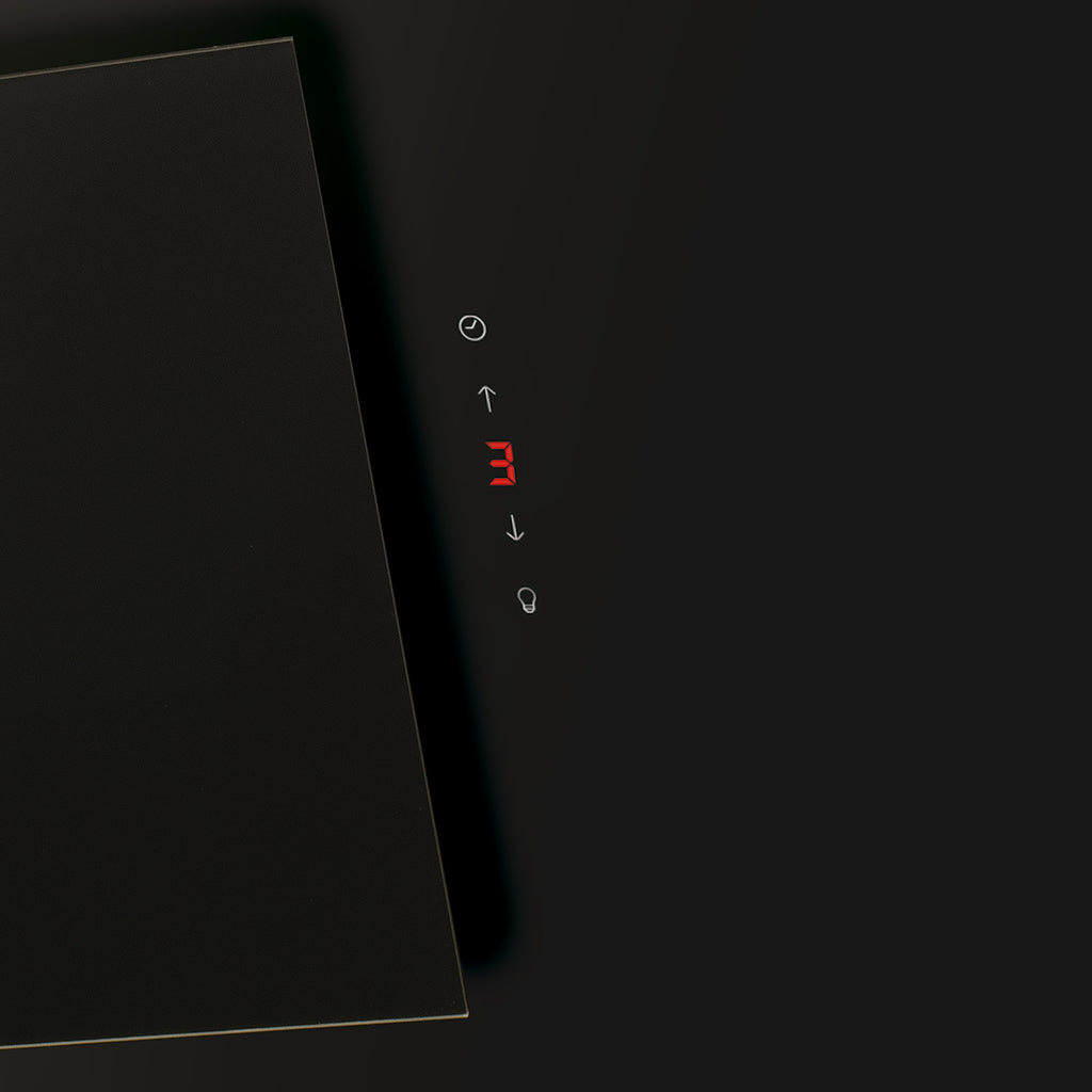 Elegante vertikale Dunstabzugshaube mit hocheffizientem, leistungsstarkem Brushless-Motor und dimmbarer LED-Strip-Beleuchtung.