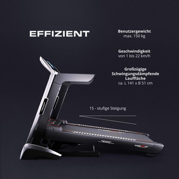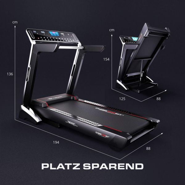 Das leistungsstarke Laufband TM 5000S bietet hohen Laufkomfort und ermöglicht es, ein Lauftraining wetterunabhängig und zielorientiert durchzuführen. Die besonders schwingungsgedämpfte Lauffläche mit „Cushion System" federt bei jedem Schritt nach und absorbiert so ungesunde Gelenkstöße. Die große Lauffläche mit 51 cm Breite x 141 cm Länge und die Laufgeschwindigkeit von max. 22 km/h schaffen sehr gute Voraussetzungen für ein Ausdauertraining für Anfänger, Fortgeschrittene und ambitionierte Jogger. Lauftraining kann das Wohlbefinden steigern und eine Körperstraffung, allgemeine Fitnesssteigerung sowie erhöhte Fettverbrennung zur Folge haben. Das Fitnessgerät spricht nahezu die gesamte Körpermuskulatur an. Der innovative, sehr gut ablesbare und beleuchtete LED-Computer mit integriertem 7"-TFT-Display bietet alles, um ein motiviertes Lauftraining zu absolvieren. Die easy-touch-Bedienfelder ermöglichen eine super leichte Eingabe. Die 4 großen Anzeigen für Entfernung, Zeit, Geschwindigkeit/Pulsfrequenz und Steigung/ca. Kalorienverbrauch informieren konstant über das Training. Die Direktwahltasten für Steigung (Stufen 3, 6 und 9) und für Geschwindigkeit (3 km/h, 6 km/h und 9 km/h) sorgen für einen sofortigen Trainingsbeginn. Aus den 35 Trainingsprogrammen kann man sich favorisierte Programme aussuchen oder nach eigenen Vorstellungen trainieren. Über das TFT-Display kannst du deine Lieblingsvideos oder Musik abspielen. Über die Bluetooth-Verbindung kannst du dich mit der Kinomap App verbinden und die Trainingsdaten speichern. Ein Audioanschluss ermöglicht, Musik von externen Geräten über die Lautsprecher des Laufbandes abzuspielen und der Kopfhöreranschluss kann alternativ zu dem Lautsprechersystem genutzt werden. Die versenkbare Halterung für Tablet und Smartphone rundet die Möglichkeiten für ein motivierendes Training ab. Über den im Computer integrierten Pulsempfänger (uncodiert 5,0–5,5 kHz) ist ein gezieltes Training mit genauer Pulsüberwachung möglich. Die Vielzahl der Trainingsprogramme (3 individuelle Trainingsprogramme, 6 Wettkampfprogramme, 24 Ausdauerprogramme mit programmierter Geschwindigkeisregelung, 2 Herzfrequenzprogramme) werden durch eine sehr genaue visuelle Darstellung zum absoluten Trainingserlebnis. Das integrierte Lautsprechersystem lässt keine Wünsche übrig. Das Soft-Drop-System unterstützt dich beim Ausklappen der Lauffläche und zum Standortwechsel werden automatisch 4 Transportrollen aktiviert, um das Laufband leicht und platzsparend wegzuschieben.