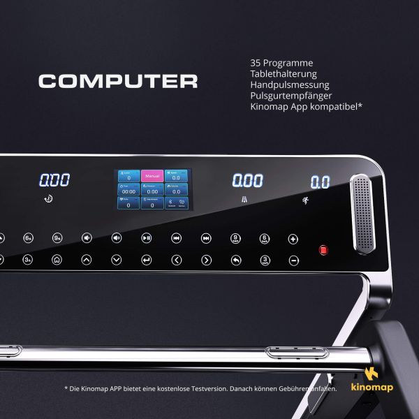 passende Bodenschutzmatte XL, Bluetooth-Verbindung für Fit-Show-App, Entertainment-Tasten für Video / Musik / Laufstreckenauswahl / Programmauswahl |