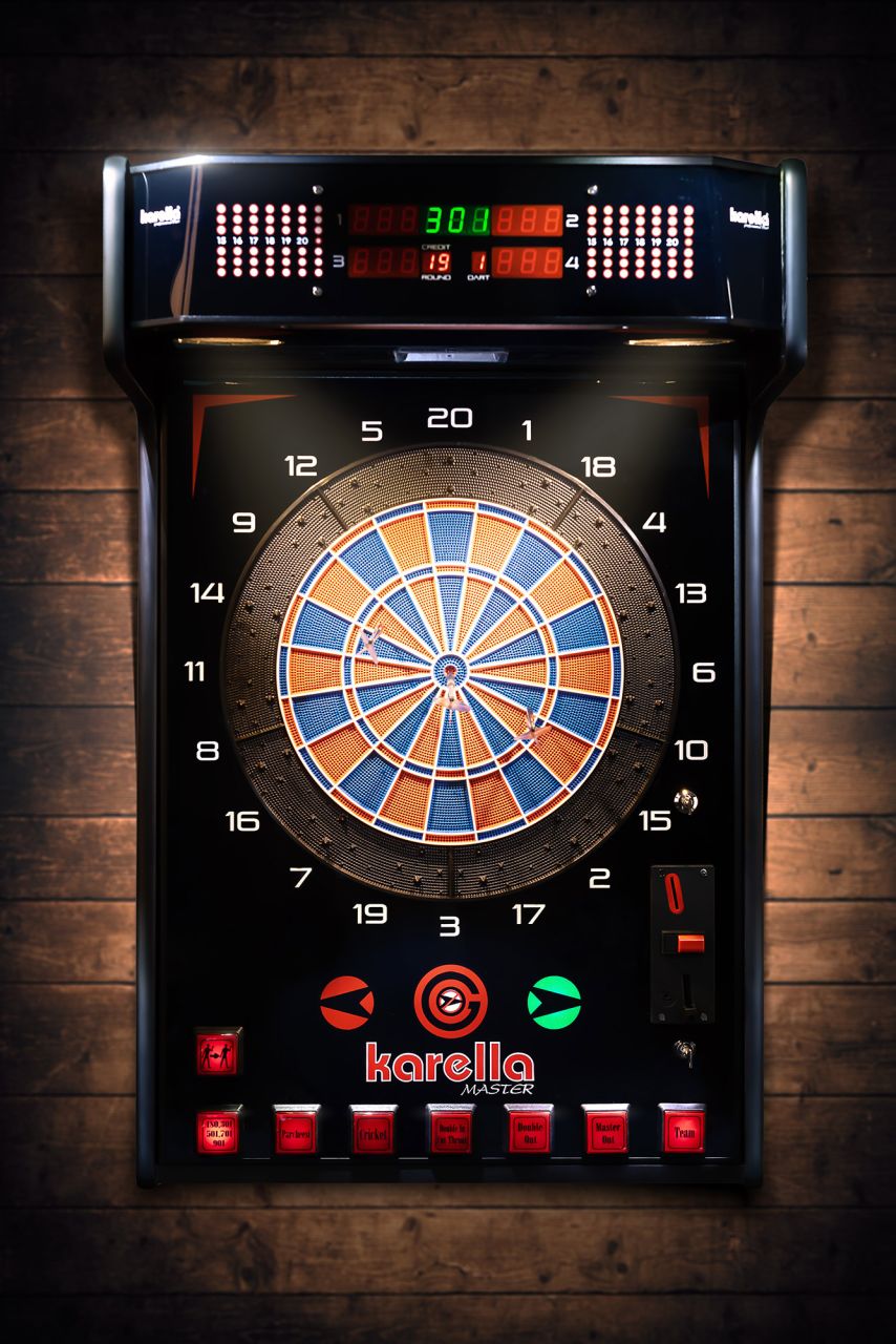 Professioneller Dartautomat mit Münzprüfer für höchste Ansprüche. Das hochwertig verarbeitete Gerät wird in der EU gefertigt und bietet die gängigsten Spiele wie 180, 301, 501, 701, 901, Cricket und Parcheesi mit den Optionen Double In, Double Out, Master Out, Team und Cut Throat. Bis zu 4 Spieler können sich gleichzeitig am E-Master duellieren. Der automatische Spielerwechsel, die integrierte Fehlwurferkennung und die optimale Ausleuchtung des Dartboards sorgen für höchsten Komfort beim Spielen.