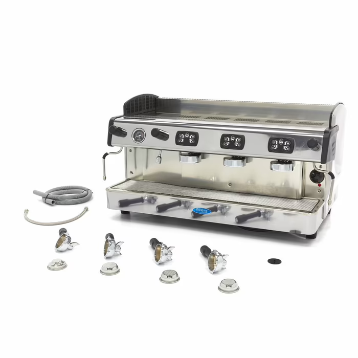 Die eingebaute Motorpumpe dieser Espressomaschine verfügt über zwei Zinsventile und einen automatischen Partikelfilter. Die Gruppenköpfe sind selbstreinigend mit einer automatischen Rückspülung. Die Maschine wird mit einem Zufuhrschlauch und einer Reinigungsmembran geliefert. Diese professionelle Espressomaschine ist einfach zu warten und zu reinigen. Sie wischen die Außenseite mit einem feuchten Tuch, mildem Reinigungsmittel und etwas warmem Wasser ab. Nach der Reinigung gut abtrocknen. Die Kaffeemaschine steht auf vier Gummifüßen für zusätzliche Stabilität.