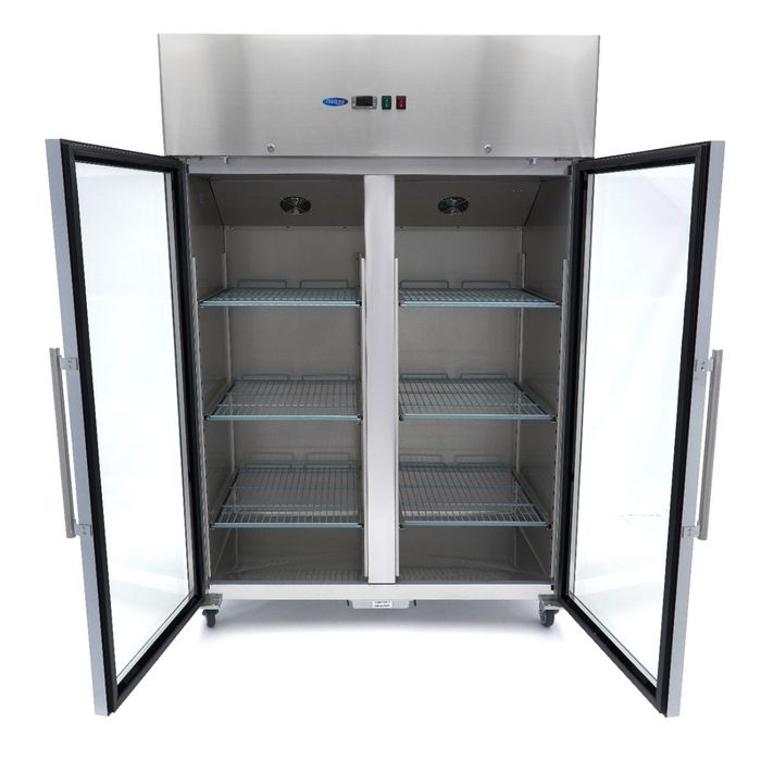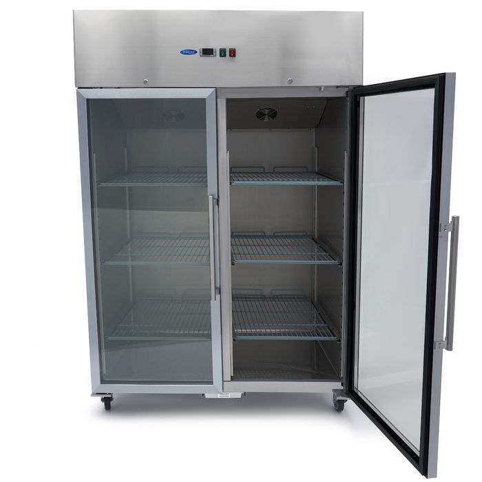 Dieser professionelle Gefrierschrank mit einer Glastür hat ein Fassungsvermögen von 1200 l. Er verfügt über selbstschließende Türen, LED-Beleuchtung und sechs höhenverstellbare Einlegeböden, mit denen Sie Ihr Layout nach Bedarf anpassen können. Dank seiner vier Räder können Sie ihn auch an den besten Platz in der Küche bringen.