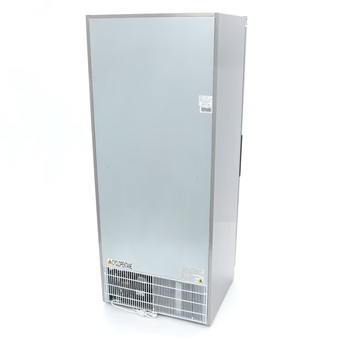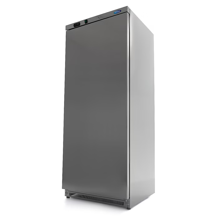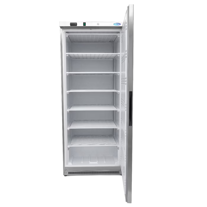Dieser Gefrierschrank aus Edelstahl hat ein Bruttofassungsvermögen von 600 l. Er verfügt über sechs feste Einlegeböden, die für eine gleichmäßige Aufteilung der Bereiche sorgen, in denen die Produkte bis zum Gebrauch gefroren bleiben.