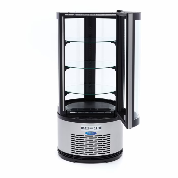 Dieser luxuriös verarbeitete runde Kühlschrank mit einem Fassungsvermögen von 100 Litern ist eine Bereicherung für jede Bäckerei, jedes Restaurant oder jeden Gastronomiebetrieb. Er verfügt über schön geschwungene Fenster und drei höhenverstellbare Glasablagen. In Kombination mit der energieeffizienten LED-Beleuchtung auf der Innenseite werden Kuchen, Gebäck und andere Backwaren buchstäblich ins rechte Licht gerückt. An der Rückseite des runden Kühlschranks befindet sich eine praktische Schwenktür, durch die die Kunden schnell bedient und die Produkte leicht nachgefüllt werden können.