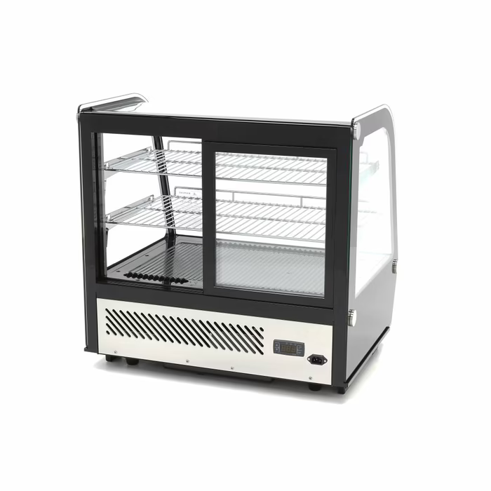 Die Deluxe-Kühlvitrine mit einem Fassungsvermögen von 120 Litern ist wunderschön verarbeitet und ideal für den Einsatz in Restaurants, Hotels, Cafés und anderen Gastronomiebetrieben. Sie ist mit zwei verchromten, höhenverstellbaren Ablagen ausgestattet. Die Kühlvitrine hat eine Doppelverglasung und eine eingebaute LED-Beleuchtung im Inneren. Damit eignet er sich hervorragend für die Präsentation von Kuchen, Pralinen und anderen Snacks für Kunden und Gäste. Auf der Rückseite befinden sich zwei Schiebetüren, so dass die Produkte leicht hinzugefügt oder entfernt werden können.
