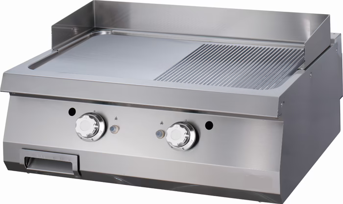 Dieser robuste Gasgrill ist aus dickem Edelstahl gefertigt und verfügt über eine glatte und gerillte Grillplatte. Er ist ideal für den intensiven Gebrauch in der geschäftigen und professionellen Küche. Darüber hinaus passt diese Grillplatte in eine Kochzeile.