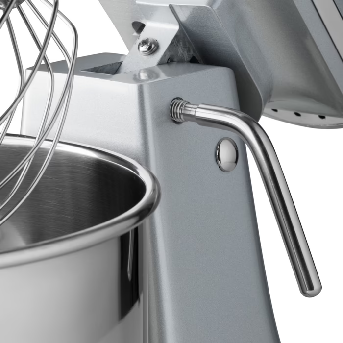 Dieser professionelle Planetenmischer ist sehr einfach und bequem zu bedienen. Mit einem Hebel lässt sich der Mixer öffnen, so dass die Rührschüssel leicht entfernt oder das Zubehör gewechselt werden kann. Der Kopf des Geräts ist mit einem Sicherheitsschalter ausgestattet, so dass die Maschine automatisch stoppt, wenn der Kopf angehoben wird. Mit den separaten Start- und Stopptasten kann das Gerät ein- und ausgeschaltet werden. Um zu verhindern, dass die beweglichen Teile während des Betriebs berührt werden, ist das Produkt mit einer Schutzabdeckung aus Kunststoff versehen. Über die Öffnung oberhalb der Schüssel können Sie auch während des Knetens oder Mischens Zutaten einfüllen. Alle Einzelteile aus Edelstahl sind spülmaschinengeeignet.