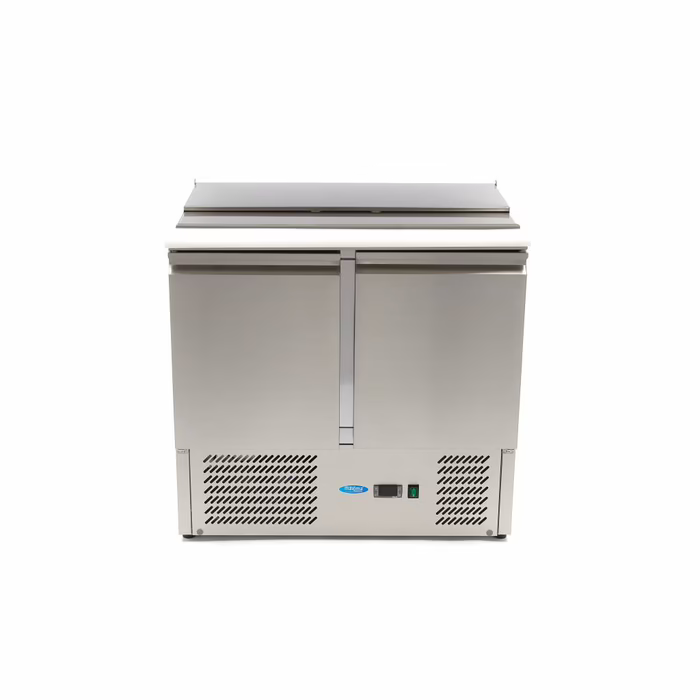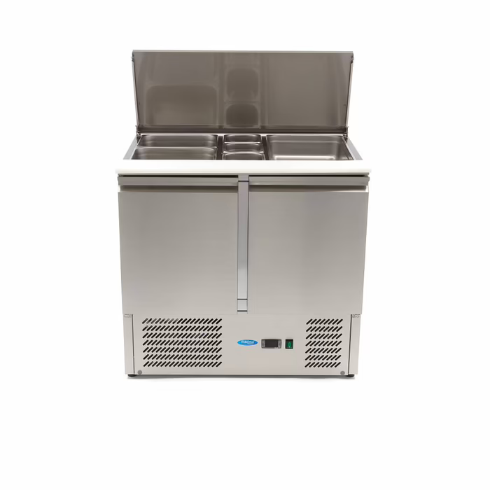 Diese schöne gekühlte Saladette ist mit zwei Türen und einem praktischen Schneidebrett ausgestattet. Die Arbeitsfläche und der Deckel dieses luxuriös verarbeiteten Geräts sind aus rostfreiem Stahl gefertigt. Mit einem Fassungsvermögen von 257 Litern kann es viele Zutaten für die Zubereitung von Salaten und Sandwiches kühlen.