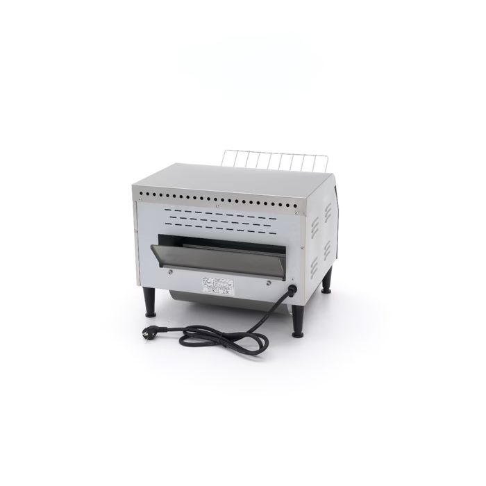 Dieser Durchlauftoaster ist ein professionelles Gerät mit einem eleganten Design und einer hohen Kapazität. Er kann bis zu 450 Scheiben Brot pro Stunde toasten. Er eignet sich auch hervorragend zum Toasten von Pistolenköpfen und Brötchen. Das Brot läuft auf einem Förderband durch den Toaster und kommt unten getoastet wieder heraus.