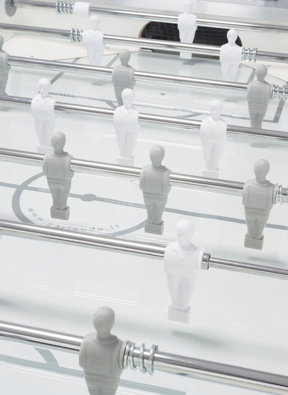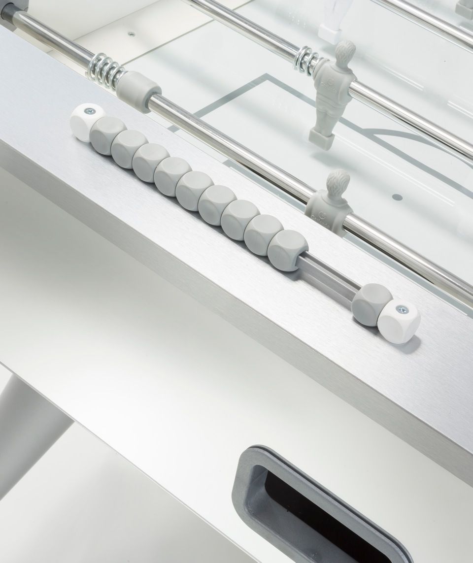 Spielfläche: Das Laminat-Spielfeld, Abmessungen 120 x 70 cm ist farblich dem Tischdesign angepasst (weiss/ silber) und mit sandgestrahltem Glas sowie aufgesetzten Kunststoff-Ecken versehen und verhindert damit das Lliegenbleiben der Kickerbälle in den Spielfeldecken.