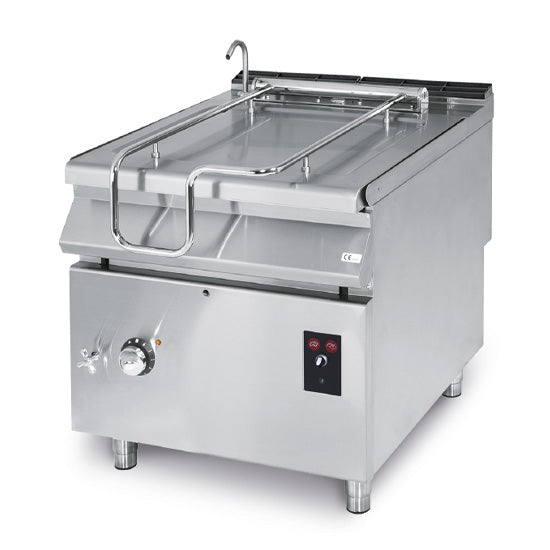 Seitenwände, Boden und Rückseite aus Edelstahl. Hinterer Kamin aus emailliertem Gusseisen. Bratpfannen aus Edelstahl und Boden aus AISI 304. Klappdeckel aus Edelstahl. Motorisiertes Kippsystem. Automatische Wasserbeladung per Druckknopf. Fester Wasserhahn oben. Beheizung durch Heizelemente, die direkt unterhalb des Kesselsbodens platziert sind. Temperatureinstellung von 100°C bis 285°C über einen an den Schalter angeschlossenen Thermostat. Sicherheitsthermostat. LEDs zeigen die korrekte Funktion des Geräts an. Speziell designte Knöpfe, um das Eindringen von Wasser in das Bedienfeld zu vermeiden. Ausgestattet mit niedrigem Kamin.