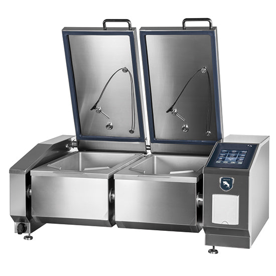 Maschinengrundrahmen Material AISI 304, Mindestdicke 2 mm. Rahmengehäuse Material ais AISI 304, beiderseits verschweisst. Heizsystem mit vollflächiger Heizverteilung durch Heizkörper aus Edelstahl. Vorheizzeit des Tiegelbodens auf die Betriebstemperatur von 180°C innerhalb von 3 Minuten. Doppelwandiger, robuster Deckel. Dampfabführung durch die Öffnung in der Deckelmitte. Grundausstattung: Automatisches Tiegeleinlasssystem mit Wasserdosierung. Mehrpunkt - Kerntemperaturfühler. Integrierter Ablass im Tiegelboden mit elektrischem Verschluss. Automatische Korbhebung durch den Hebearm. Integrierte Handbrause mit Rückholautomatik. Integrierte Steckdose 230 V /16 A. USB Schnittstelle. Internetverbindung. Kochprozesse: Kochen, Sanftes Kochen, Frittieren, Schmoren, Niedertemperaturgaren, Grillen, Rösten, Anbraten, Konfieren, Sous-Vide Garen, Kochen über Nacht.Funktionen: 12" Touch screen in Farbe. Speicher von bis zu 800 Programmen. Mehrsprachig. Möglichkeit zum Erstellen von eigenen Rezepten. Temperaturkontrolle per Sonde. Fehleranzeige im Display.Abmessungen der Bodenwanne: 2x 355x561 mm. Innere Tiefe: 170 mm. Kochfläche: 2x 20 dm².