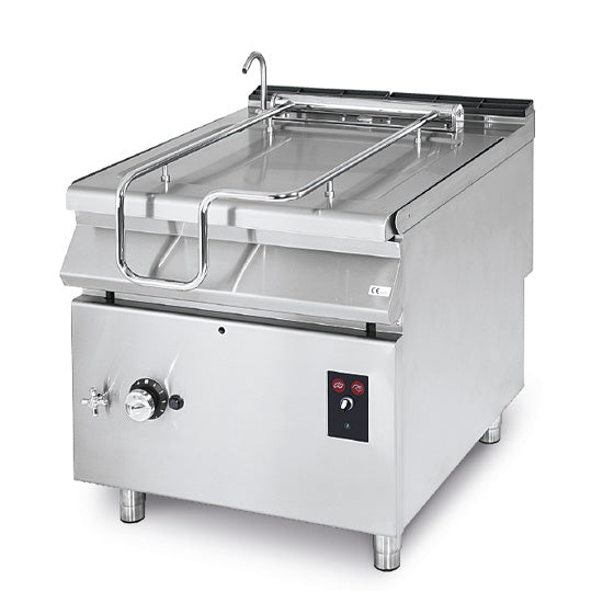 Seitenwände, Boden und Rückseite aus Edelstahl. Hinterer Kamin aus emailliertem Gusseisen. Bratpfannen aus Edelstahl und Boden aus AISI 304. Klappdeckel aus Edelstahl. Motorisiertes Kippsystem. Automatische Wasserbeladung per Druckknopf. Fester Wasserhahn oben. Heizung durch hocheffiziente Stahlbrenner. Gasversorgung durch ein multifunktionales Thermostatventil. Pilotbrenner zum Einschalten der Hauptbrenner. Temperatureinstellung von 100°C bis 285°C.Speziell designte Knöpfe, um das Eindringen von Wasser in das Bedienfeld zu vermeiden. Ausgestattet mit niedrigem Kamin.