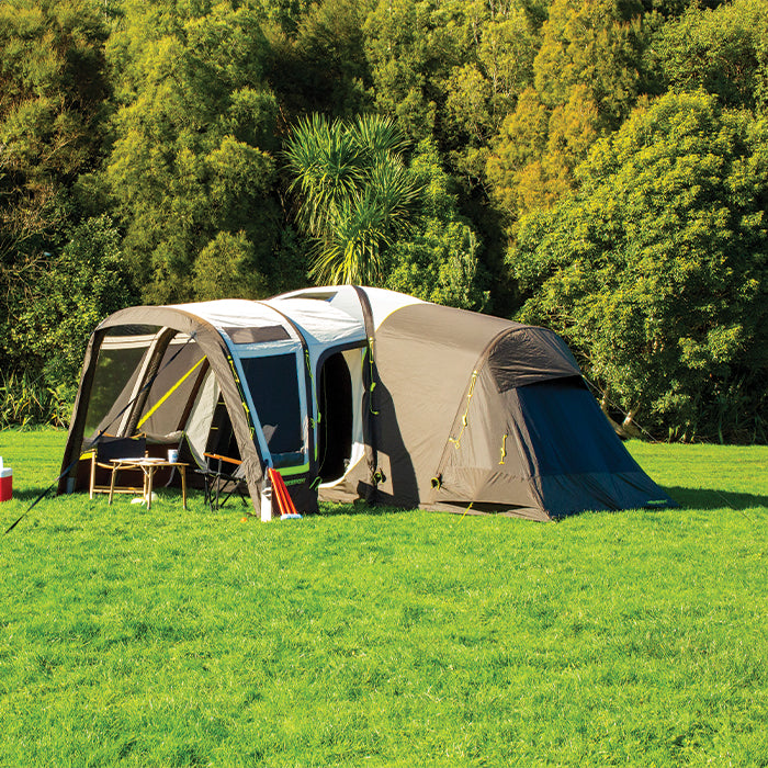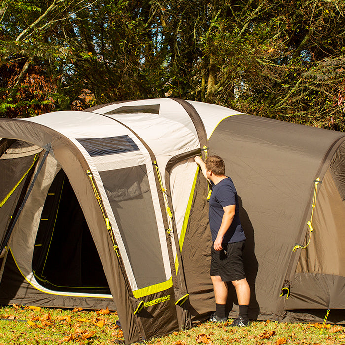 Das Pro II V2 Luftzelt zeichnet sich durch erstklassige Eigenschaften, Privatsphäre und einen schnellen Aufbau aus. Der vollständig aufblasbare Rahmen mit zentraler Kreuzstruktur bietet erhöhte Stabilität und einen großzügigen Wohnraum. Dies führt zu erhöhter Privatsphäre durch individuelle Schlafräume. Der Vorzeltbereich kann mit einem optionalen Wandset oder mit einem Aerobase Pavillon verbunden werden, um einen zusammenhängenden, vergrößerten Wohnraum zu schaffen.